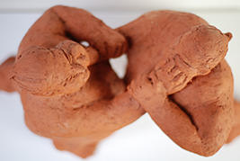 Baking clay, base: solid African wood. Hight 22,5 cm with the base.